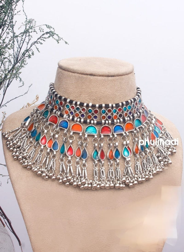 Suvesha Silver Plated Oxidized Afghani Multi Color Necklace
