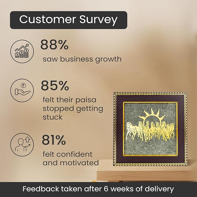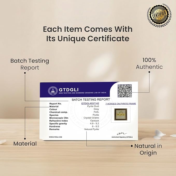 7 Horses on Raw Pyrite Frame Harness the power of Surya Dev's celestial horses with this striking raw pyrite frame. Designed to attract career growth, recognition, and professional success, this piece channels the energy of speed and ambition into your workspace. The raw pyrite base acts as a natural wealth magnet, energizing your goals for business breakthroughs and financial advancement. Place it on your office desk or workspace to remove obstacles, accelerate project completion, and cultivate an atmosphere of positivity and focus. Beyond its spiritual significance, this frame serves as stunning home and office decor that blends aesthetic beauty with Vastu principles. The intricate seven-horse design brings honor and respect while elevating any living room or professional environment. Beautifully packaged in a gift box, this piece makes a meaningful present for anyone seeking prosperity, ambition, and spiritual growth. A thoughtful choice for professionals, entrepreneurs, and those who value symbolism in their surroundings.