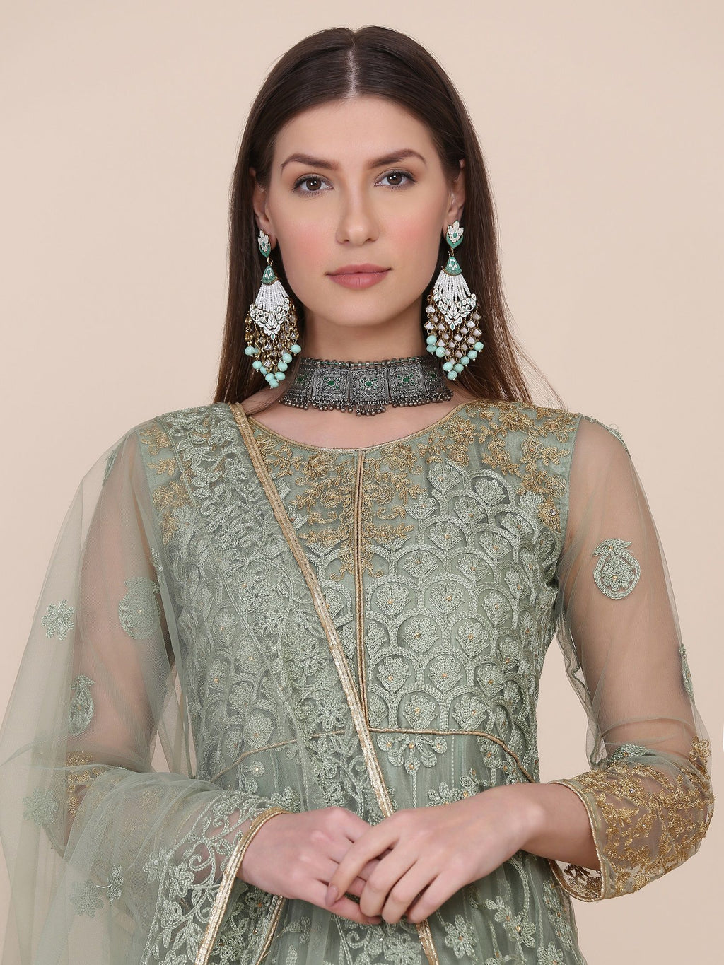 Dupatta: Matching Light Green Net Dupatta to complement the entire look
