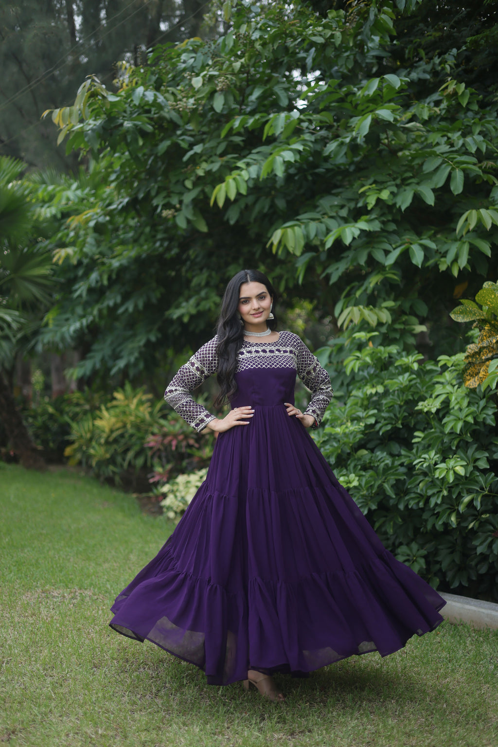 Aastha Purple Faux Blooming Russian Silk with Gown Embroidered Zari Sequins-work
