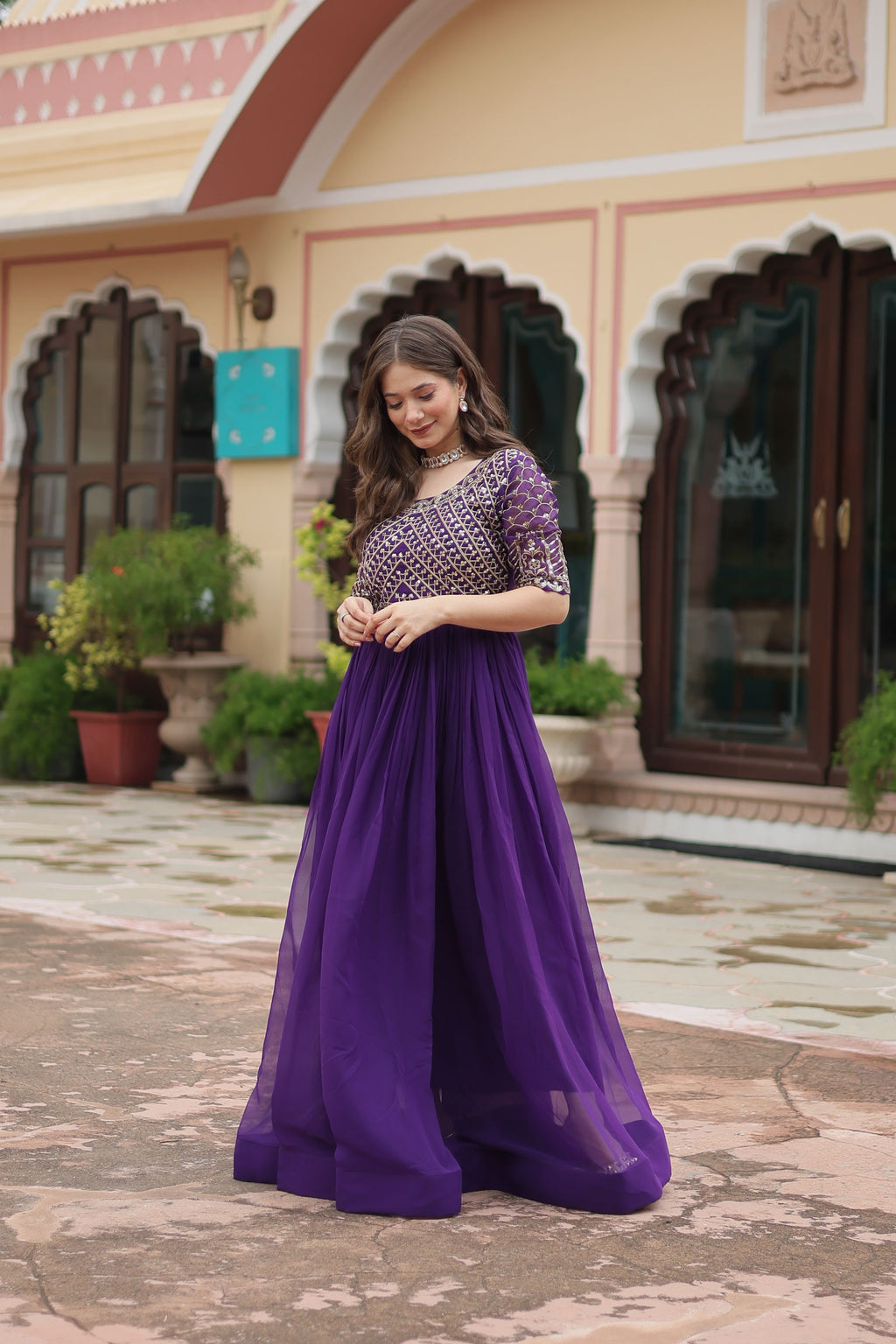 Add royal charm to your look with the stunning Aastha Purple Gown, crafted from premium faux blooming fabric. Designed with detailed zari and sequins embroidery, this gown blends tradition with elegance for your special moments.