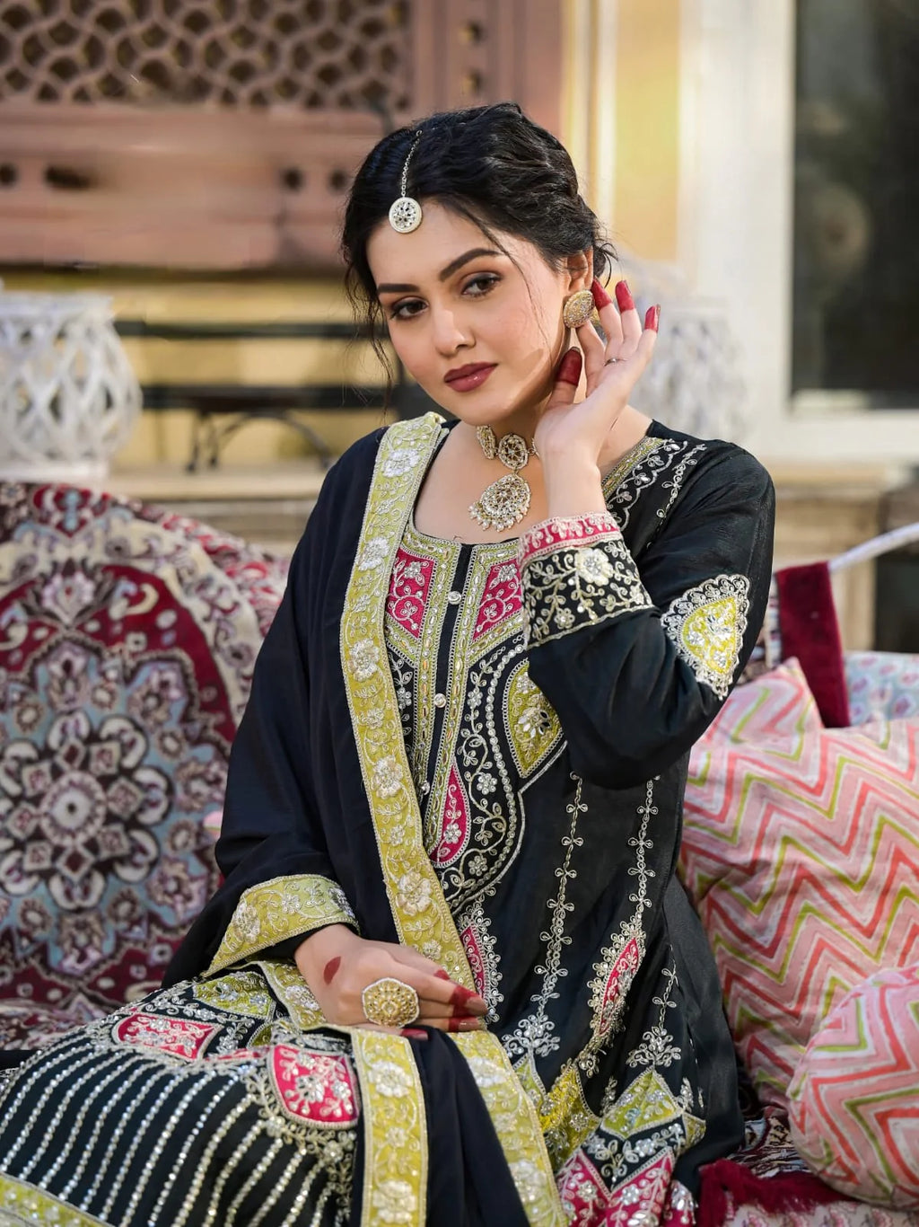 Indian Clothing Suvesha || Airjet Chinon With Jhadha With Heavy Embroidery Heavy Mirror Stone Work A-Line Kali Cut Stich Suit Set Is Beautifully Decorated Real Mirror Pasted. It Is Paired With Plazo (Divider) And Dupatta Cut Heavy Embroidery Cut Work || Color : Black || Set Include : Kurta, Plazo & Dupatta || Top Fabric: Pure Airjet Chinon || Plazo Fabric : Pure Airjet Chinon || Dupatta Fabric : Pure Airjet Chinon || Occasion : Festival, Party, Casual