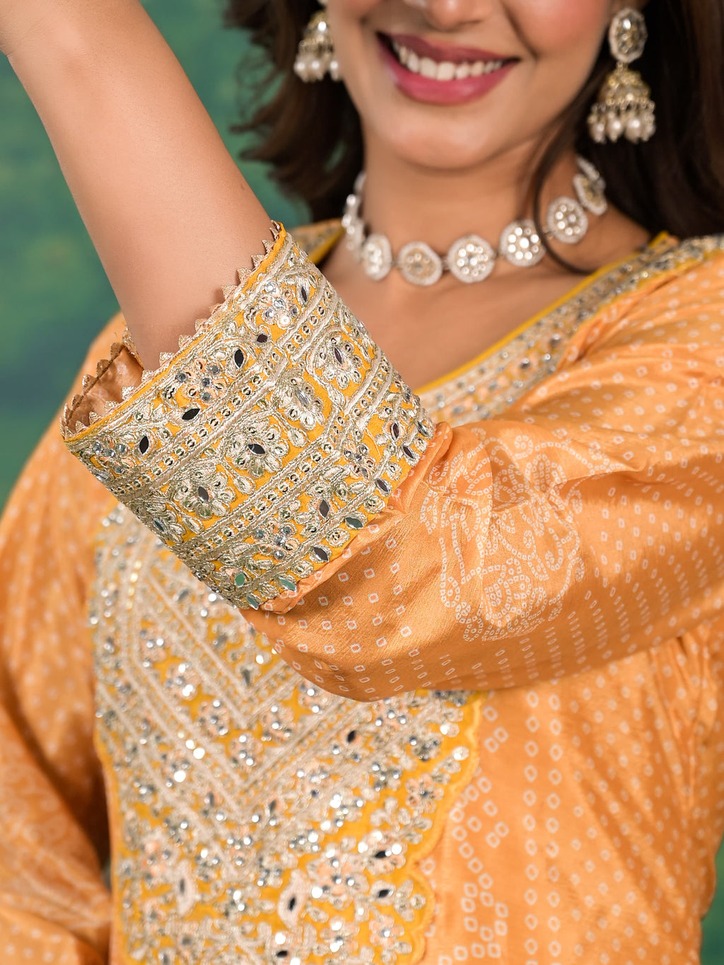 Indian Clothing Suvesha || Chinon Plazzo Suit Set With Bandhani Digital Print With Hand Work & Mirror Work Embroidery With Linning || Color : Mustard Yellow || Set Include : Kurta,Plazzo &Dupatta || Occasion : Festival, Party, Casual, Wedding