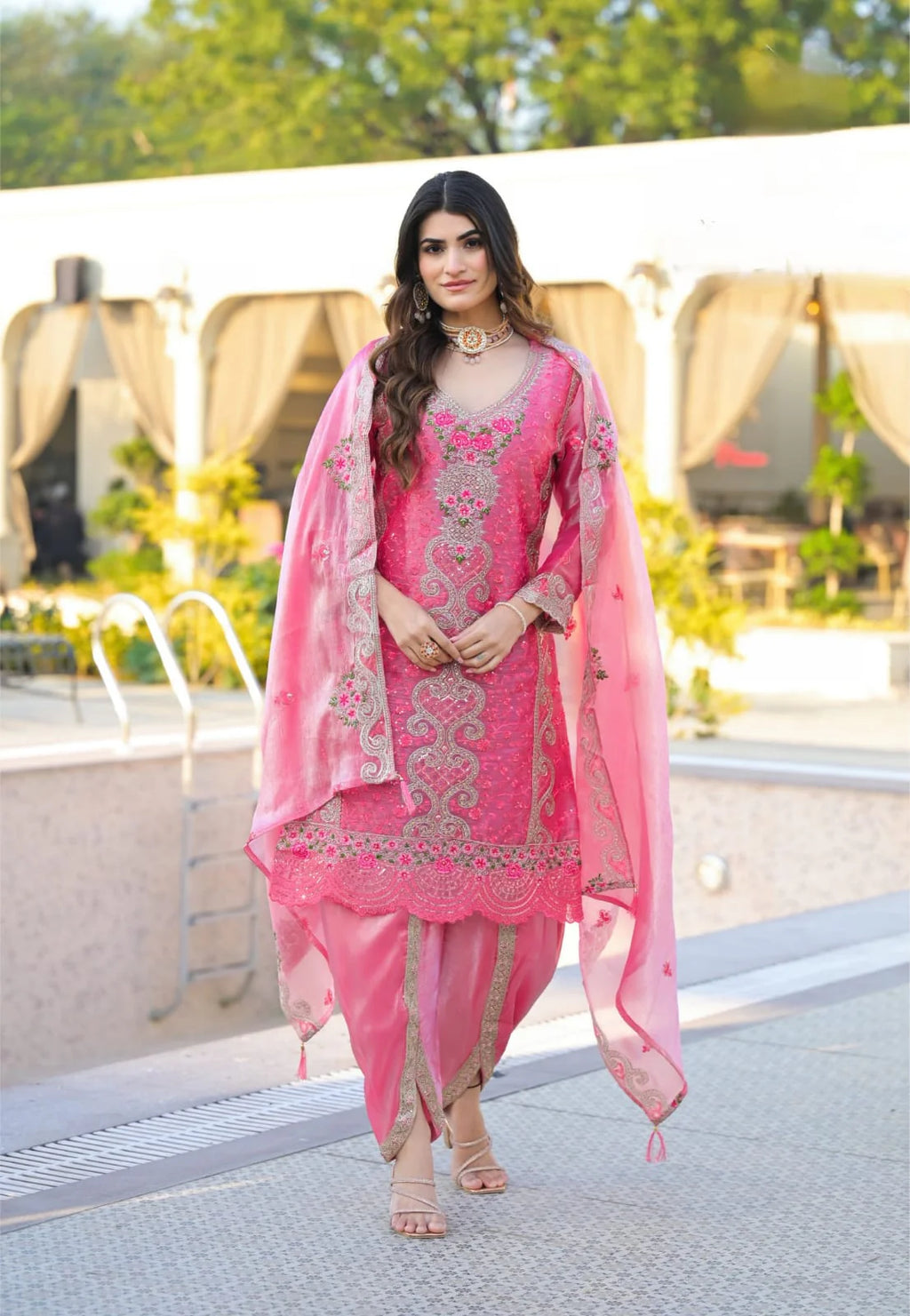 Indian Clothing Suvesha || Dhoti Suit Set With Heavy Embroidered Work Multi Work || Color : Pink || Set Include : Kurta, Dhoti, Dupatta || Top Fabric: Jimmi Choo Fabric With Hand Work Heavy Embroidery || Dhoti Fabric : Jimmi Choo With Heavy Embroidery Both Side || Dupatta Fabric : Jimmi Choo Fabric With Heavy Embroidery || Occasion : Festival, Party, Wedding