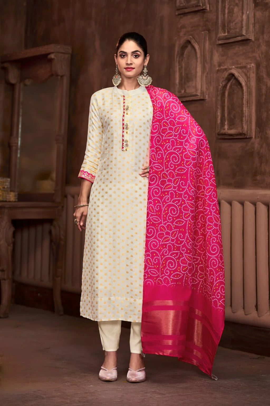 Indian Clothing Suvesha || Suit Set With Beautiful Lace & Hand Work Button || Color : Off White || Set Include : Kurta, Pants & Dupatta || Top Fabric: Russian Silk Fabric || Plazo Fabric : Pure Chinon With Heavy Embroidery Both Side || Dupatta Fabric : Russian Silk Fabric Bandhej Print || Occasion : Festival, Party, Wedding
