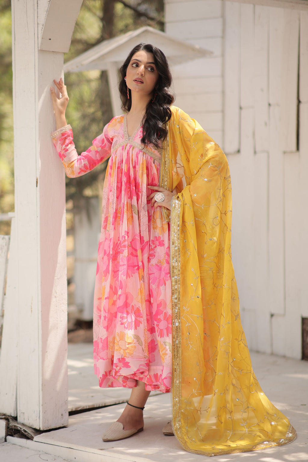 Turn heads with the stunning Aastha Pink Gown, beautifully crafted in premium Russian silk and enriched with vibrant digital prints. Designed for modern elegance, this gown offers comfort and style for any festive or wedding occasion.