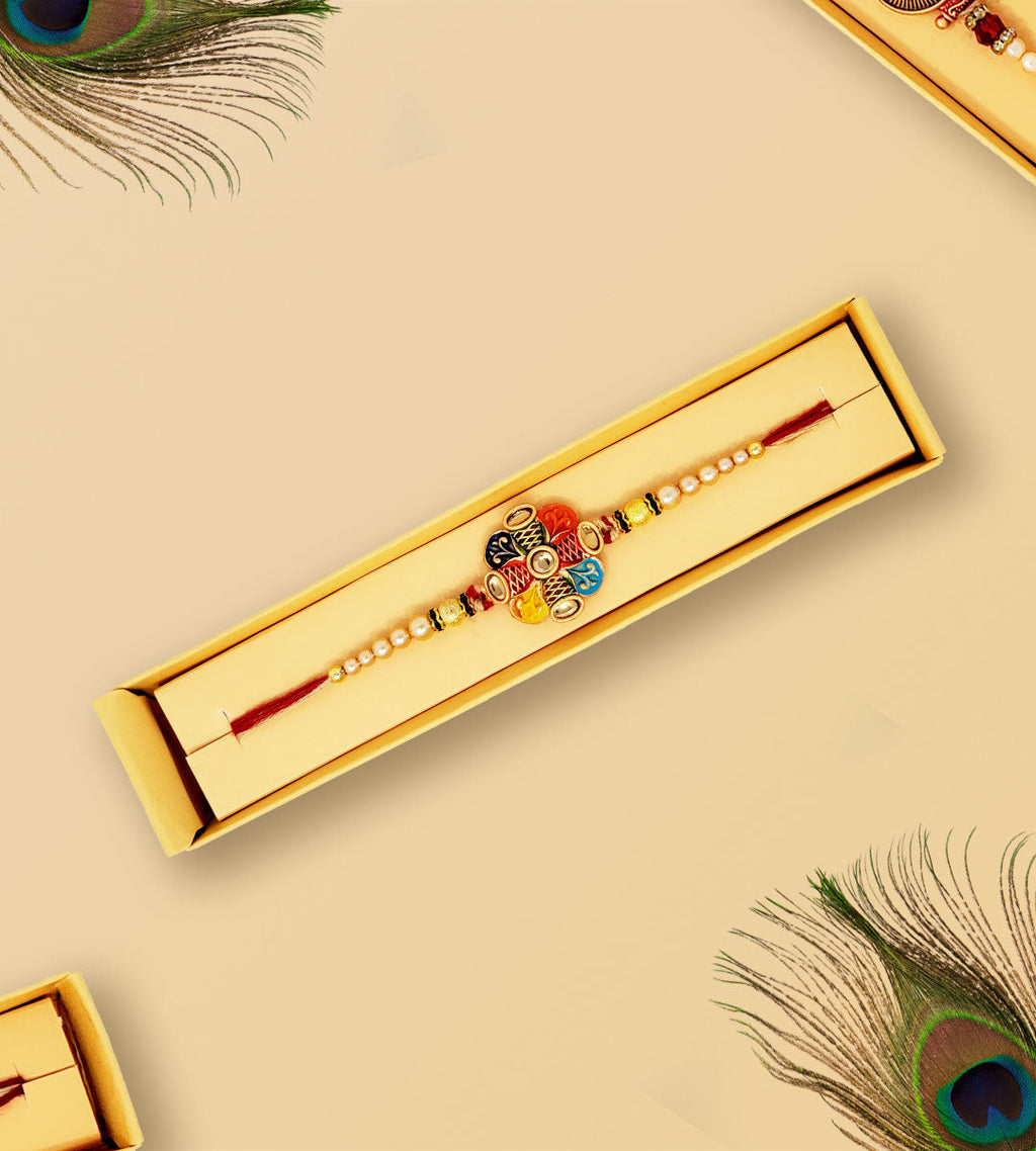 Antiquity, beauty, and royalty go hand in hand. This set of rakhi depicts this beautiful combination in hues of maroon and gold. The metal centerpieces are beautifully augmented in Flower shape with stylish beads and CZ stone rings. The maroon and gold tying thread gives an aura of elegance to them.