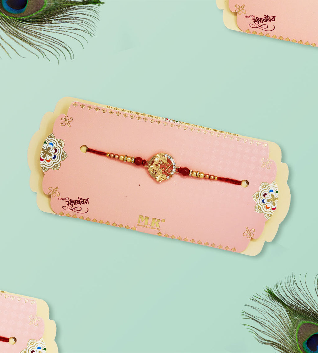 This beautiful MR Butterfly Rakhi is the perfect way to show your brother love and appreciation. It features a golden butterfly design with intricate detailing and a colorful stone in the center. The vibrant colors and craftsmanship make this a truly special rakhi. The adjustable thread ensures that it fits comfortably on any wrist. Sending your brother a rakhi is a way to show him how much you care and value him. With this MR Butterfly Rakhi, your brother will know that you are thinking of him and wish him the best. Celebrate the special bond between brothers with this beautiful rakhi.
