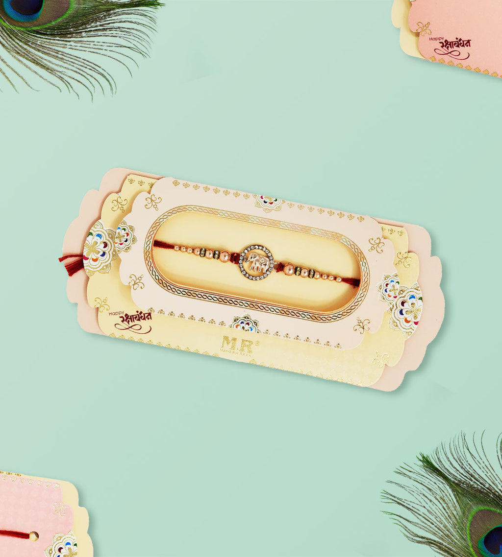 This beautiful MR Elephant Decorative Rakhi is the perfect way to show your brother your love and appreciation on Raksha Bandhan. Crafted from premium quality metal alloy, this Rakhi is adorned with an intricate design of an elephant. The vibrant colors of the stones and pearls used in the design make it all the more attractive. The stylish design of this Rakhi will make it an eye-catching addition to your brother's wrist. Buy this unique decorative Rakhi and make your brother feel special on this special occasion.