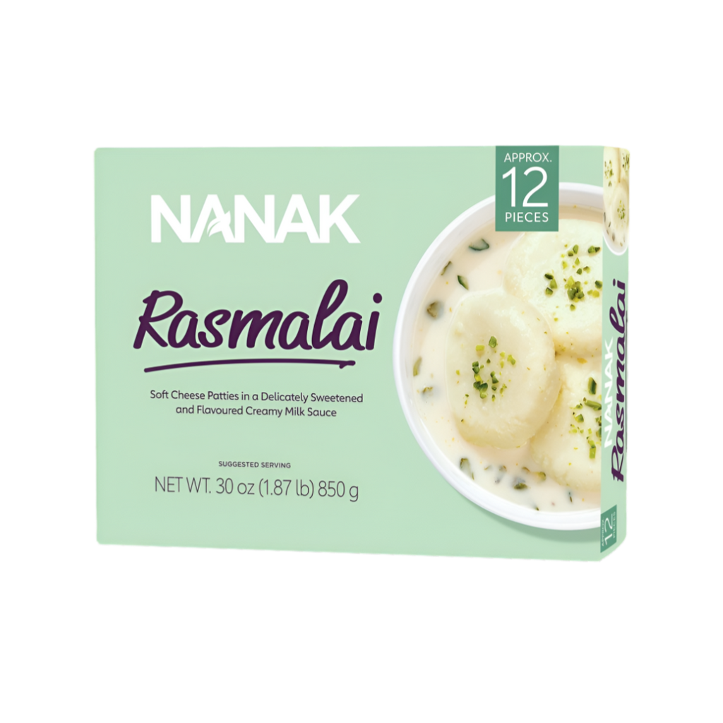 Spice Divine Nanak Rasmalai (12Pcs) 850g is a classic Indian dessert crafted for lovers of milky sweets. The pack features soft, spongy, and succulent cottage cheese patties that are soaked in a creamy, sweetened, cardamom-flavored milk syrup, delivering a heavenly experience with each bite. This Rasmalai is renowned for its quality and authenticity, prepared with the finest ingredients to ensure that each piece melts in your mouth, leaving a rich and creamy taste that lingers. Perfect for those special occasions or simply as a luxurious after-meal dessert, Nanak Rasmalai captures the essence of authentic Indian sweets and remains a favorite among the Indian diaspora.