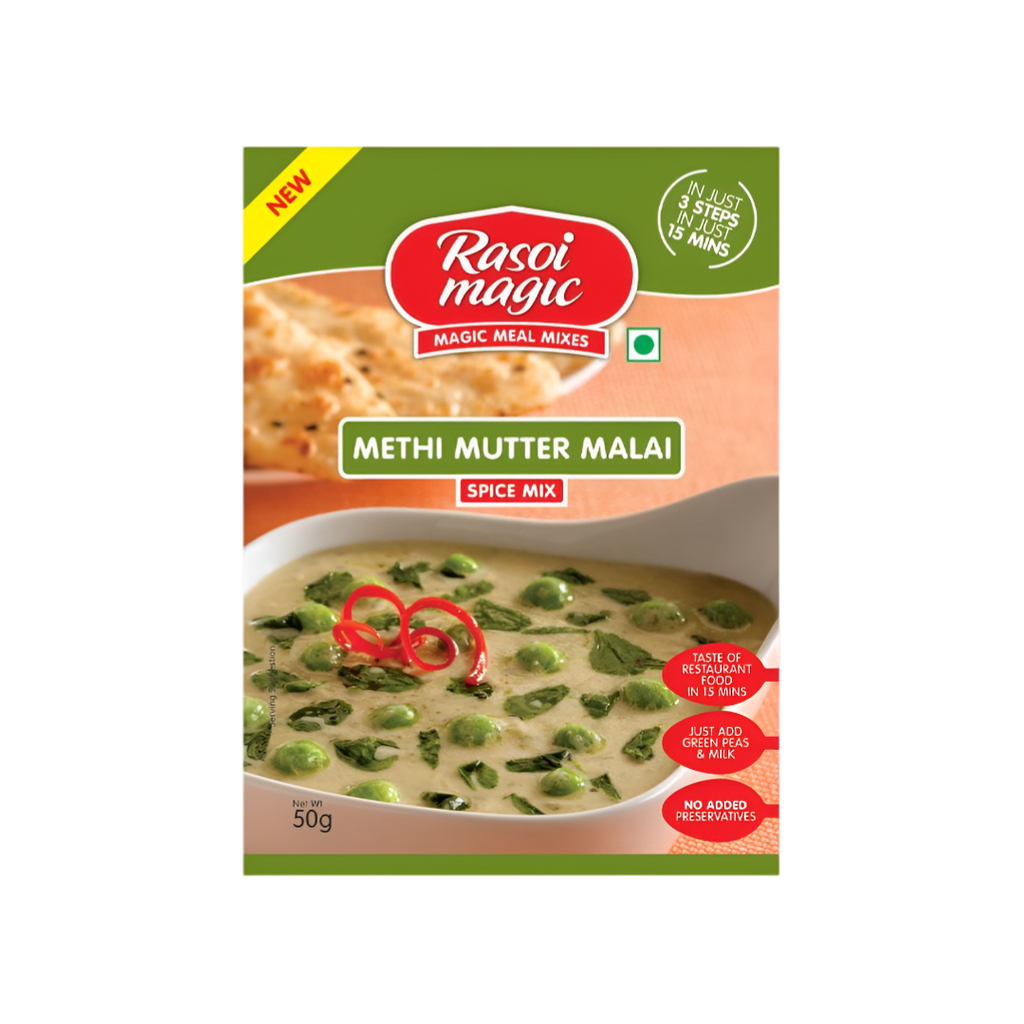 Discover the rich flavors of North India with Rasoi Magic's Methi Mutter Malai spice mix. This expertly blended spice packet simplifies the preparation of the classic Methi Mutter Malai dish, a creamy and aromatic curry that combines the robustness of fenugreek leaves (methi) with the sweetness of green peas (mutter) in a luscious, creamy sauce.