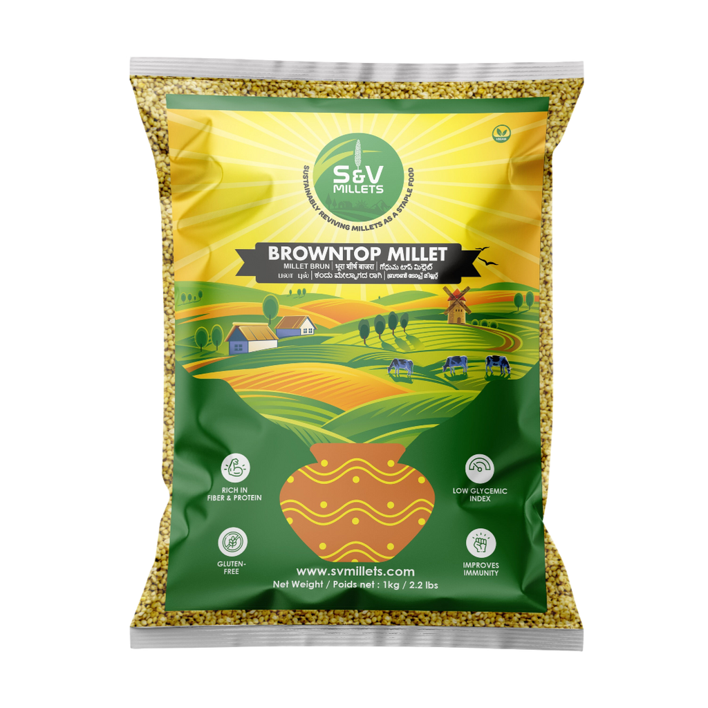 SV Browntop Millet is a treasure trove of nutrition, a perfect addition to your healthy diet. Originating from the diverse and vibrant lands of India, this millet, known locally as 'Korale', is a staple in many traditional Indian cuisines. Browntop millet stands out for its exceptional health benefits, making it a must-have in your pantry.