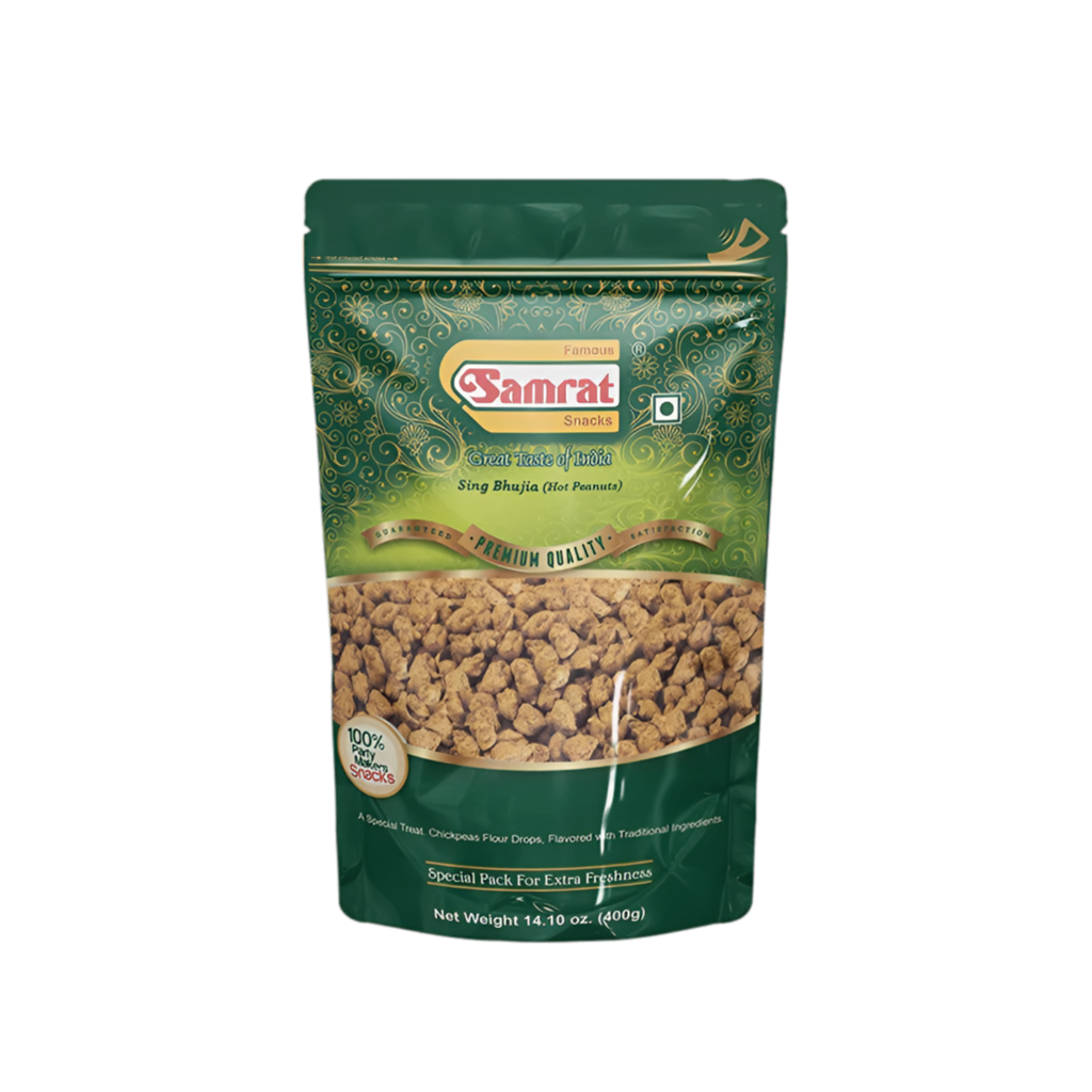 Sing Bhujia is primarily made from high-quality, crunchy peanuts, which are coated with a flavorful blend of spices and gram flour. This coating is a masterful mix of traditional Indian spices, including turmeric, red chili powder, and a blend of other aromatic seasonings, which give Sing Bhujia its distinctive taste. The peanuts are then deep-fried to perfection, ensuring each bite is deliciously crispy.