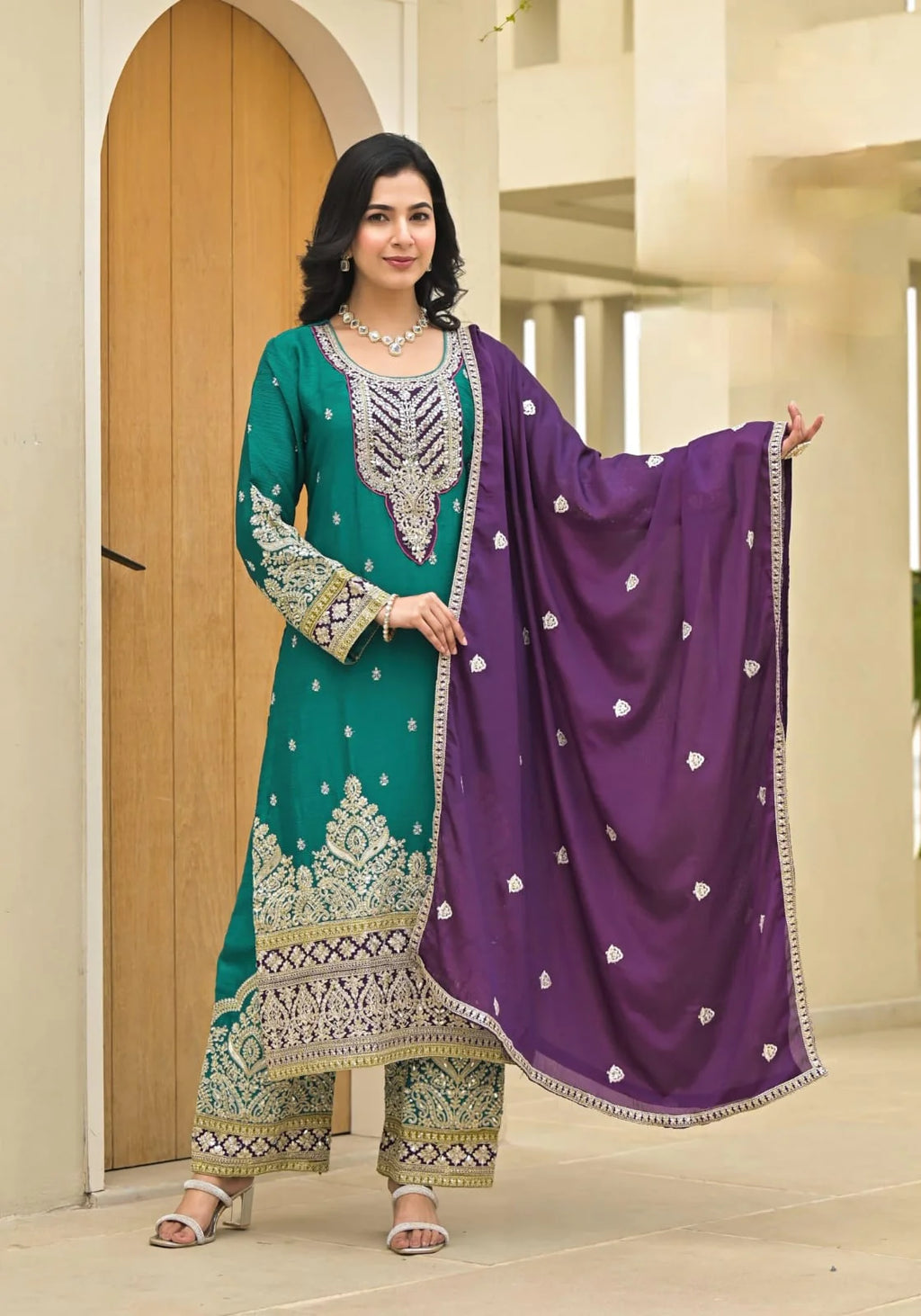 Indian Clothing Suvesha || Plazzo Suit Set With Beautifully Heavy Embroidery It is paired with matching plazo and dupatta || Color : Sea Green / Voilet || Set Include : Kurta,Plazo & Dupatta || Occasion : Festival, Party, Casual