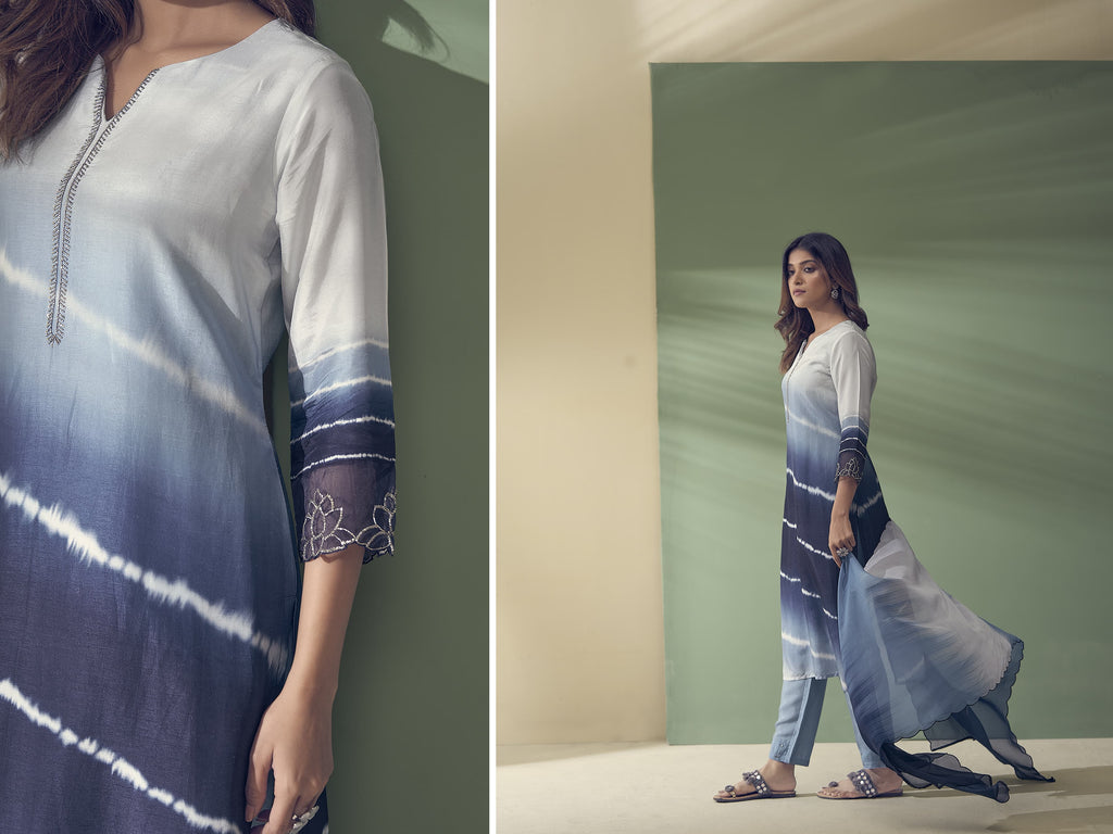 Indian Clothing Suvesha || Pure Dola Muslin Suit Set With Digital Print || Color : Blue (Double Shaded) || Set Include : Kurta,Pants & Dupatta || Occasion : Festival, Party, Casual