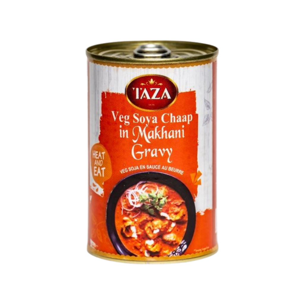 Taza Veg Soya Chaap in Makhani Gravy is a sumptuous, vegetarian delight that masterfully blends the richness of traditional Indian cuisine with the health-conscious needs of modern diets. This ready-to-eat dish features soya chaap, a popular meat substitute in India, drenched in the creamy, indulgent makhani gravy, a beloved North Indian sauce known for its smooth texture and aromatic spices.