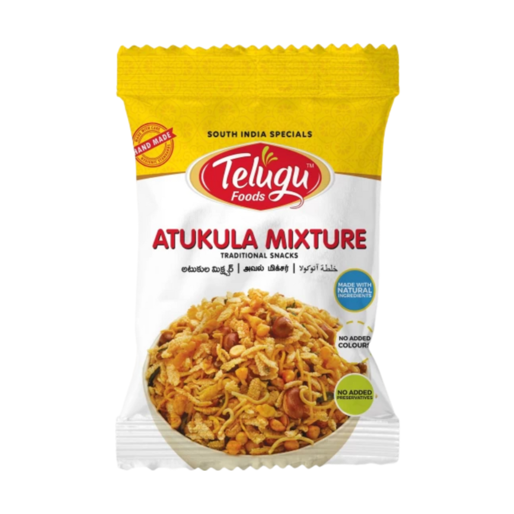 Telugu Foods Atukula Mixture is a delightful and crunchy snack that brings the traditional flavors of Andhra Pradesh right into your home, wherever you are in the world. Perfect for Indian immigrants missing the taste of home and snack enthusiasts eager to explore the rich diversity of Indian snacks, this mixture is a vibrant blend of puffed rice (atukulu), peanuts, roasted gram, curry leaves, and a variety of spices that create a tantalizing flavor profile.