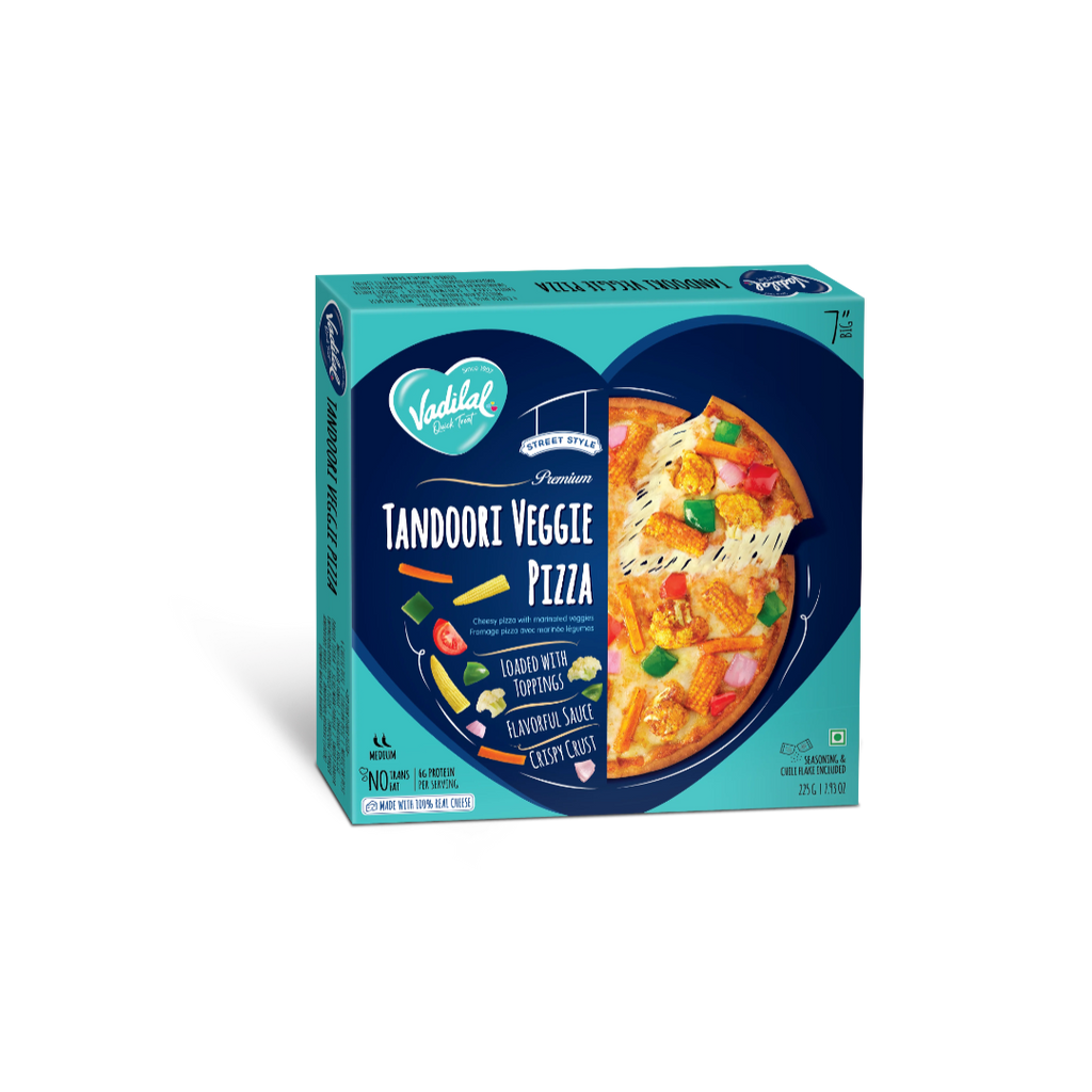 Experience the fusion of Italian tradition and Indian flavors with Vadilal's Tandoori Veggie Pizza. This unique offering combines a crispy pizza crust with a homemade, flavorful tandoori sauce, topped with fresh vegetables and melted cheese for a truly satisfying meal.