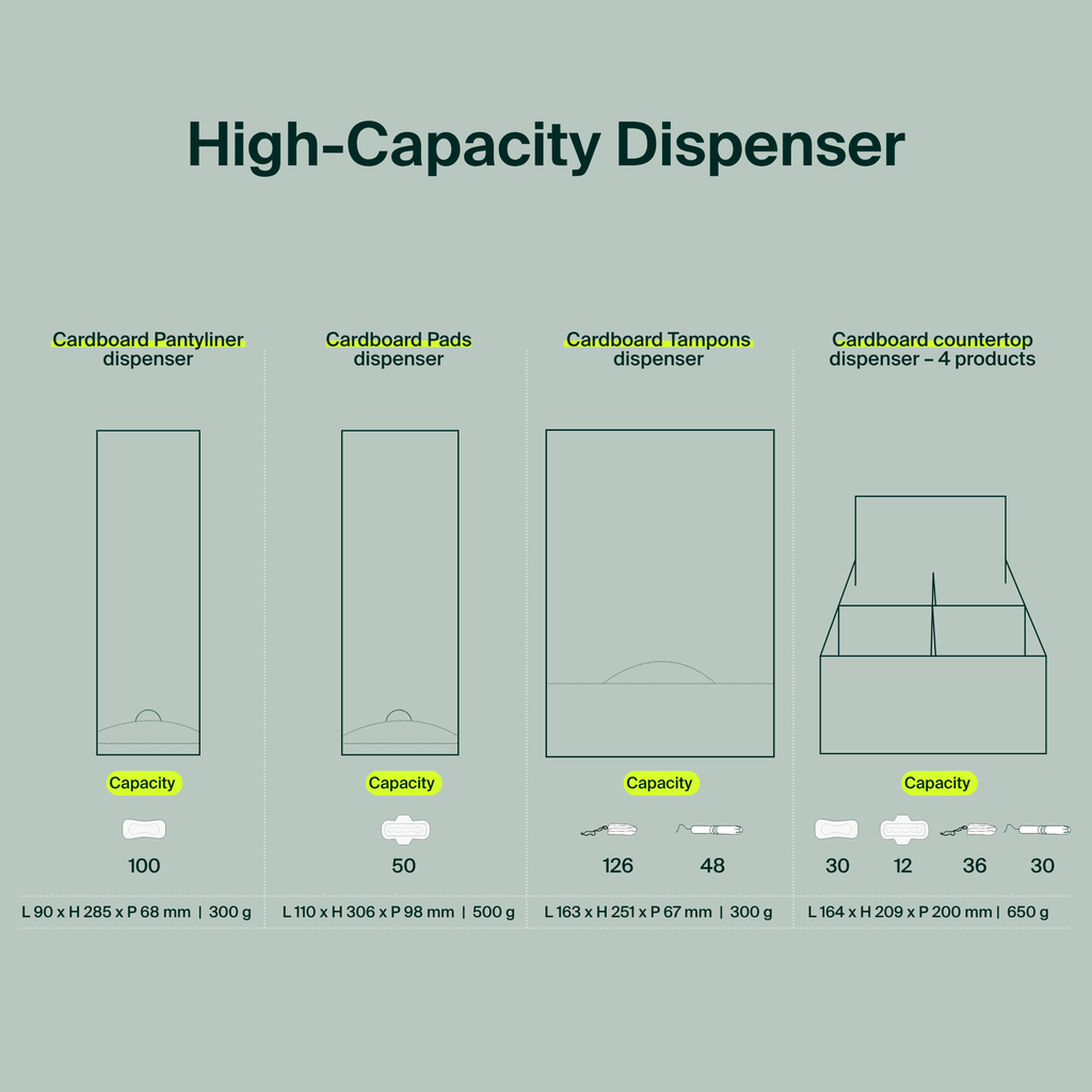 Created specifically to fit tampons (with or without an applicator), this dispenser offers a greater storage capacity than our plexiglass type.